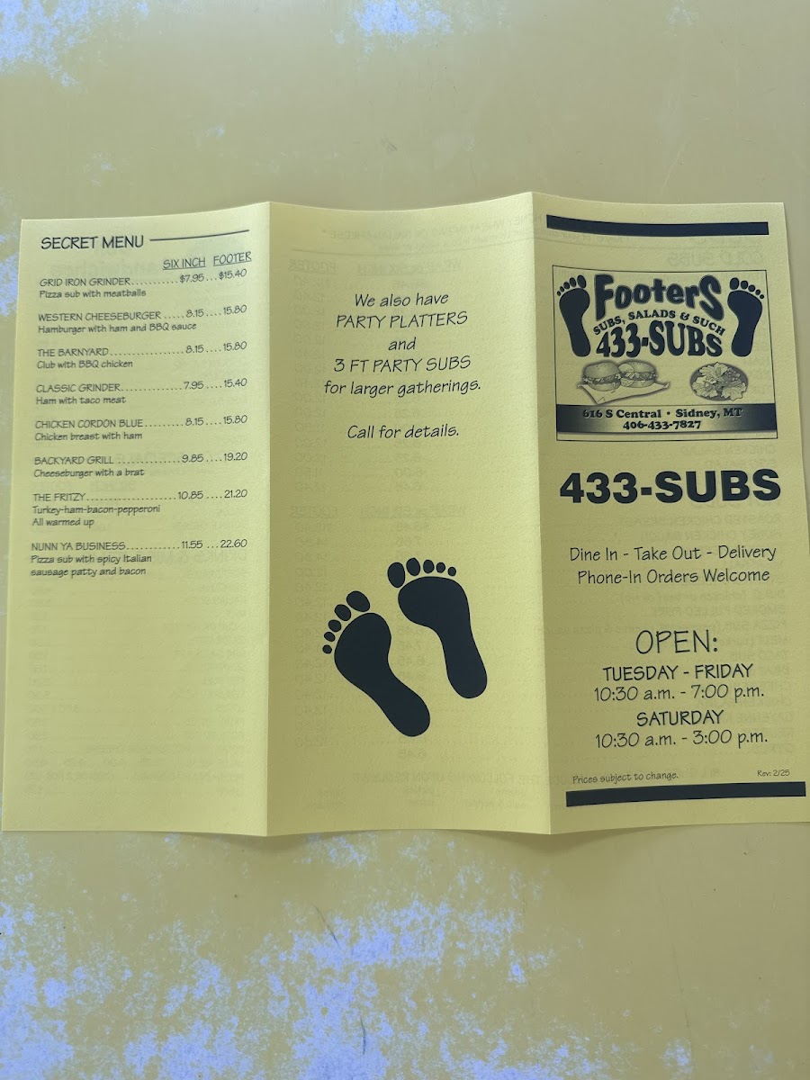 Introducing the Menu at Footers, a beloved gem located at 616 S Central Ave, Sidney, MT, Footers is a cherished spot for sandwich lovers. With an impressive selection of deli sandwiches ranging from Seafood Crab to Chicken Salad, patrons can indulge in crafted combinations that elevate the humble sandwich into a gourmet experience. The house-made bread is a standout feature, which many locals agree surpasses mainstream options.